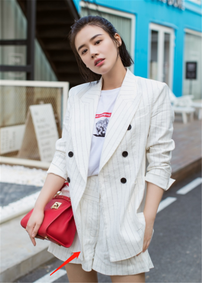 穿起西装仍然很让人惊艳,下身搭配的是同色系的西装短裤,同样是条纹的设计,洋气又显瘦,能够很好地秀出一双美腿,这样的她是不是格外有魅力呢
