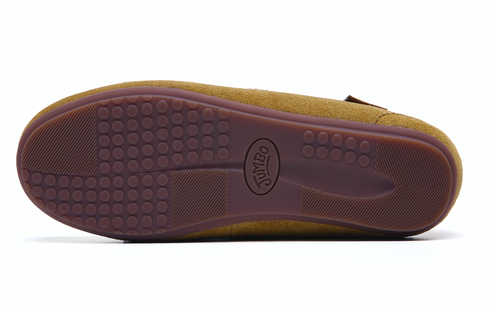这双羊皮毛一体豆豆鞋的鞋面用的是牛皮做的绒面革。经过打磨之后的表面皮层,有着细腻的磨砂质感,随意弯折的柔软度,舒适性和透气性都很好。