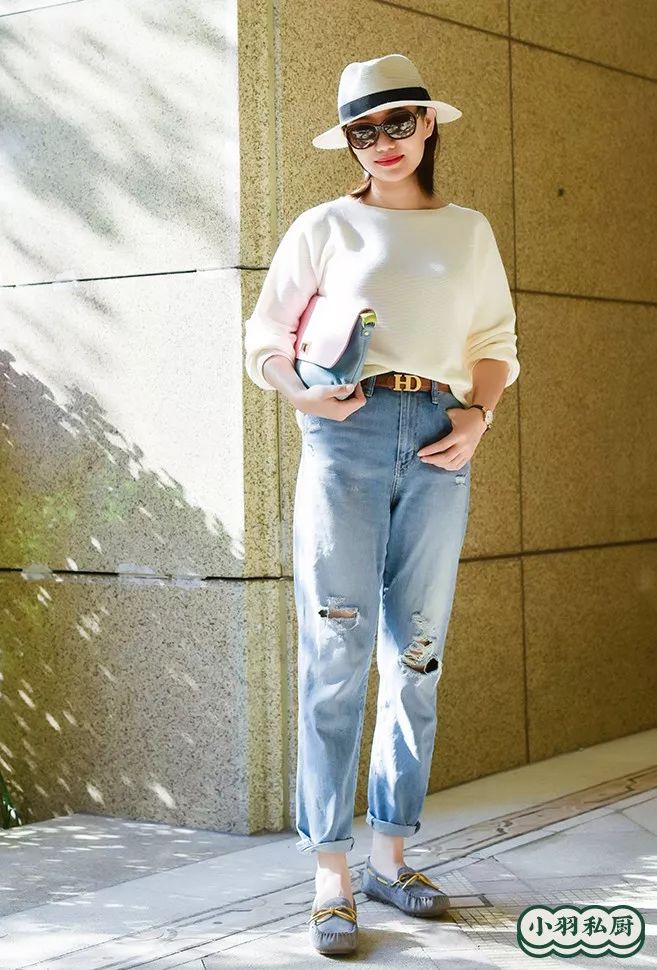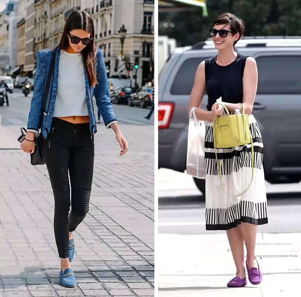 因为豆豆鞋本身就是低帮的款式,露出脚背和脚踝有拉伸腿线的效果,如果穿上袜子就会显得很臃肿,打破整个造型的清爽感和休闲感。所以请你一定要光!脚!穿!