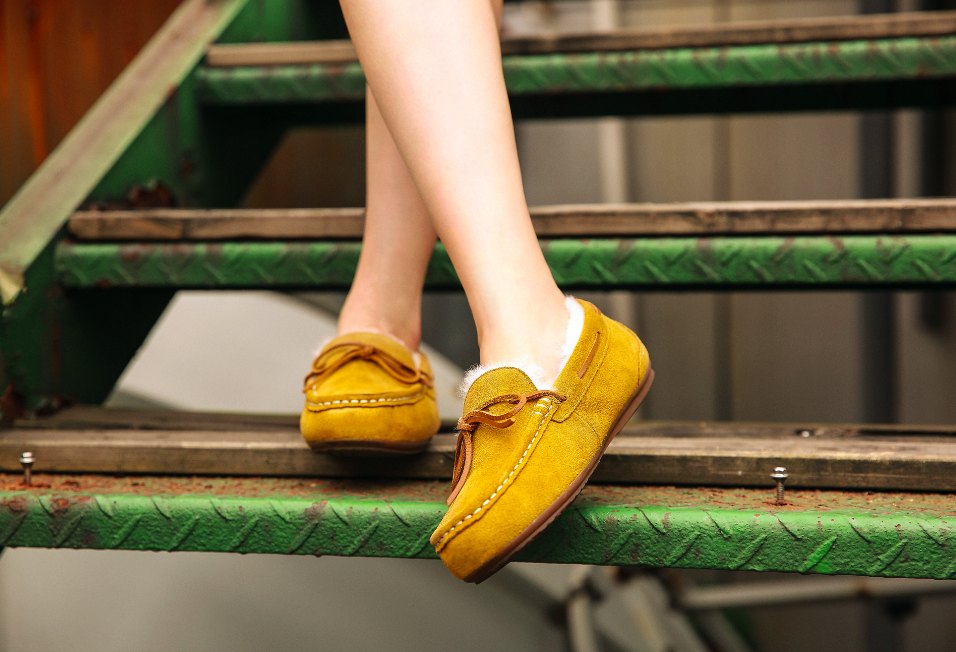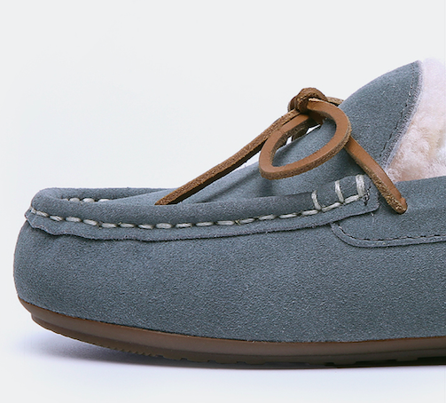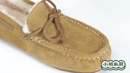 这双羊皮毛一体豆豆鞋对双脚的包裹性非常好,因为它的鞋楦头根据亚洲人的脚型进行了改良设计。圆形鞋头的设计,穿上后使双脚在鞋内有足够的空间,既不会觉得挤脚,也不压脚背,还让双脚看起来很秀气。