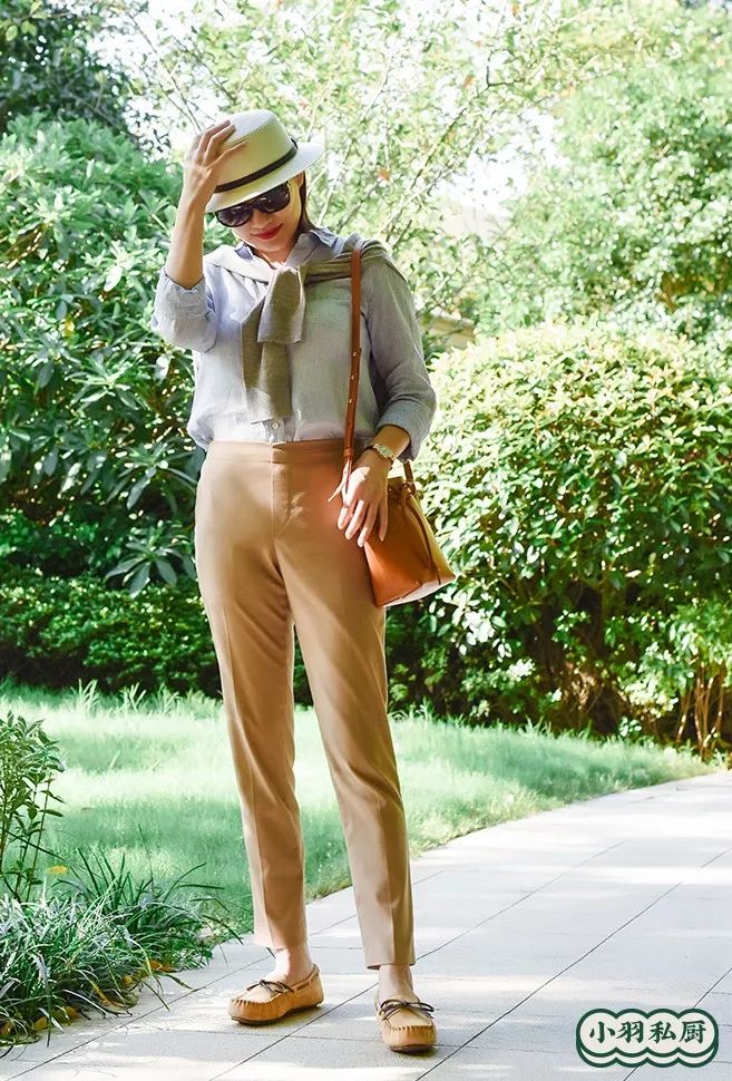 栗色的豆豆鞋搭配同色系的裤子,能在视觉上拉长下半身比例,再用一件亮色的上衣提亮上半身,整体看起来就非常清爽了。