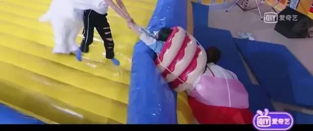 第三个游戏是穿着充气服在气床上抢真假兔兔。