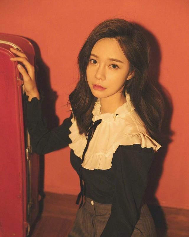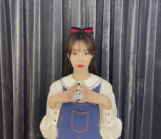 这是日常穿的套装,为了让沈梦辰看起来很甜,白色的儿童领衬衫,整个人都散发着孩子气可爱的气息,再加上浅蓝色的牛仔裙,就像校园里可爱的中学生一样,沈梦辰发型也很适合这件衣服的风格,轻薄的空气刘海,高半扎的头发,上面的黑色头发,红色条纹丝带的发夹能从内部散发出全体人的甜美氛围。