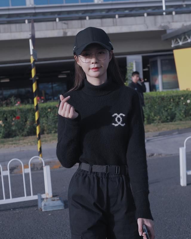 眼前出现的这件衣服有点霸气,整体色调比较统一,只有黑白,很清爽,黑色夏奈尔针织衫的高领搭配黑色高腰裤,非常有个性,黑色酷酷帅气的皮鞋将小腿紧紧包住,霸气十足,与黑色帽子搭配,黑色皮质挎包上有金色链子。
