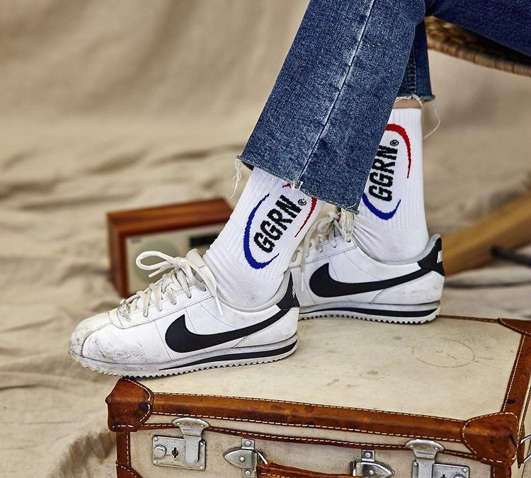 热衷于时尚的潮人们就上网搜索Winter衣服的牌子了,因为领口和袖口都印着LOGO「GGRN」的字样,找起来也是容易了许多,只是不搜不知道,一搜吓一跳,这哪里是潮服啊,明明是袜子啊?!也就是说SM娱乐的造型师把袜子改造成了衣服穿在了Winter身上,袜口上印着LOGO的松紧部分变成了领口、袖口。小编一边感叹造型师的奇思妙想,一边惊叹Winter是有多瘦才可以把袜子当衣服穿啊,顺便也超级好奇这身Look到底用了几双袜子?