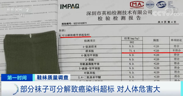 检测报告显示,国家相关强制性标准规定,可分解致癌芳香胺染料不得超过20毫克/千克,这款从直播平台购买的袜子,可分解致癌芳香胺染料达71毫克/千克。