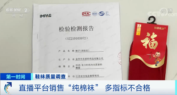 某直播平台这家店铺销售的一款袜子,主播宣称是纯棉加厚的,然而在江苏省市场监督管理局最新公布的袜子抽查结果中,这款袜子的纤维含量和甲醛含量等两项指标不合格,检测结果显示,这款主播宣称纯棉的袜子产品标称棉含量为85%,实测棉含量为65%,30%以上的聚酯纤维含量则没有标注,这款袜子是抽查中不合格项目最多的样品。