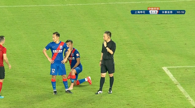 相比之下,上海申花队的情绪非常低落。尤其是大将军秦升,亚泰的绝杀球,正是由于他送给对手点球,导致申花被逆转。令人忍俊不禁的是,当裁判判罚点球后,秦升为了证明自己也是受害者,迅速脱掉了自己的鞋子和袜子,速度之快,令人称奇。镜头一晃,他已经脱掉了鞋子,指着脚让裁判看,镜头再一晃,秦升连袜子都脱下来了。不过秦大将军的努力无济于事,他刚才解围的速度远远比不上现在脱鞋脱袜子的速度,最终裁判还是判罚了点球。