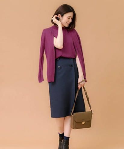 另外,下身搭配深蓝色的前扣裙子,可以营造出时尚、稳重的氛围。手拿的包选择棕色系的话,能酿造出更成熟的女性,所以推荐哦。