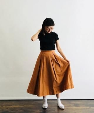 如果是棕色的话,在办公室里也不会轻浮,所以推荐给人女人味印象的喇叭裙。如果将其他配饰与黑色搭配在一起,则可以营造出沉稳的氛围。