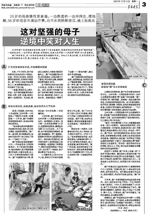 26岁的黄广林身患慢性肾衰竭,他做了7年血液透析,为凑治疗费,梁绍兰白天在医院做保洁工作,晚上陪儿子摆摊卖袜子、捡废品,日复一日,不知疲倦。
