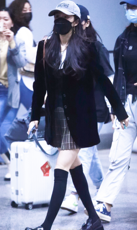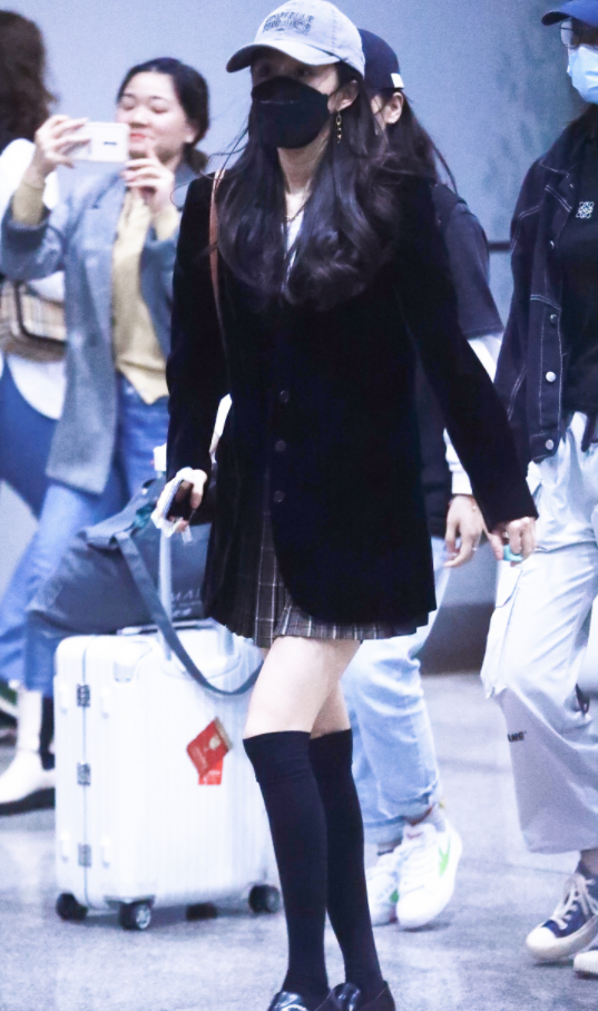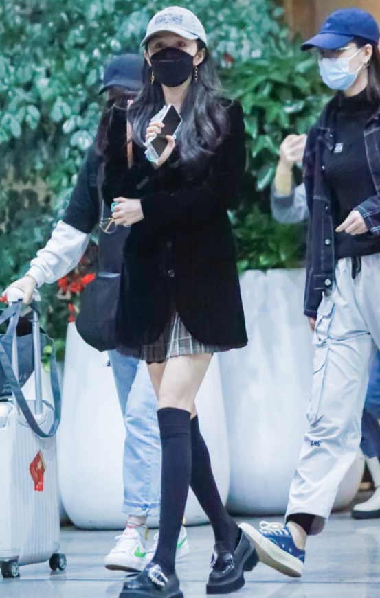 这条JK裙长度看着比黑色长袜还要短的设计更足以说明杨幂穿搭上的勇气,感受她这秀出来的细长直美腿完全就是不给00后们留活路。