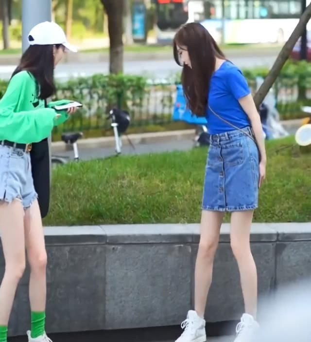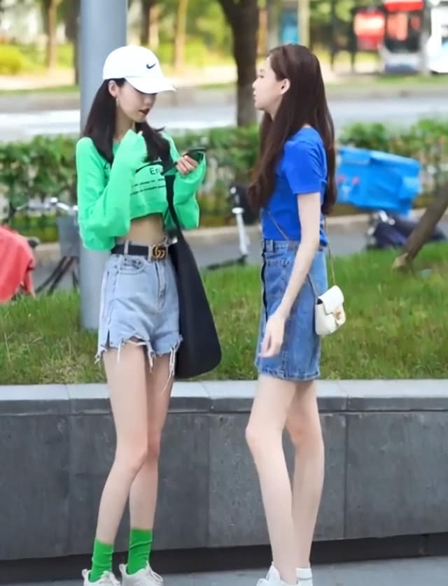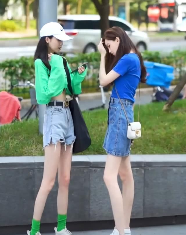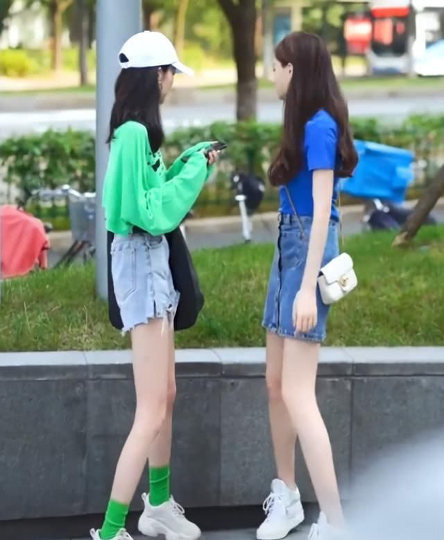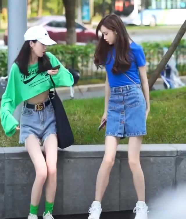 二人都是时尚达人,一个戴着白色棒球帽,穿着绿色长袖T恤,或者是露脐装的设计,一气呵成,一气呵成。又看了看她的闺蜜,右边的小妹妹穿着一件蓝色短袖T恤,和绿色一样引人注目。为显出腿长,她把T恤插在下面的裙子上!