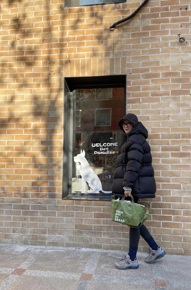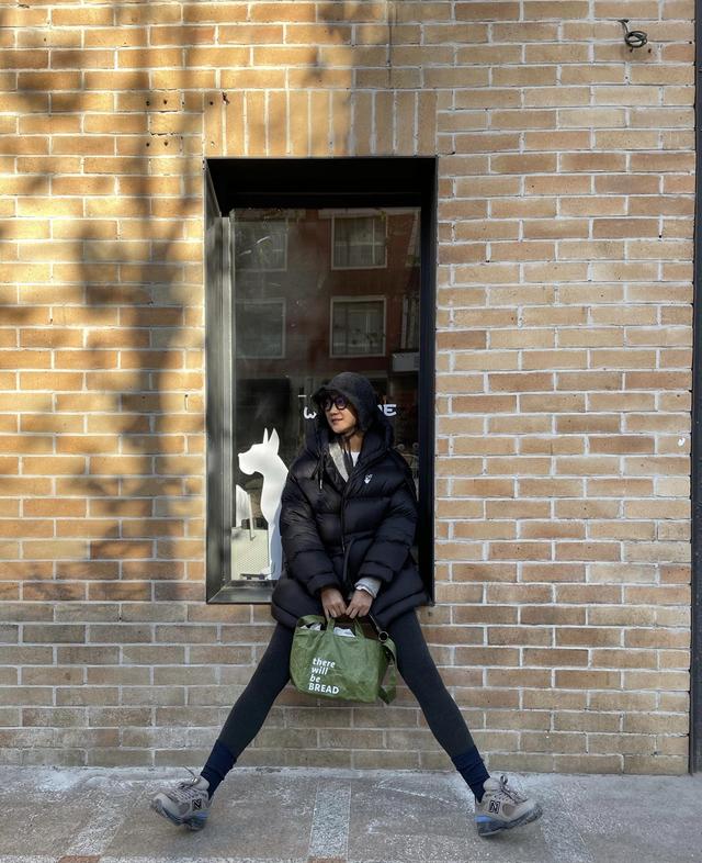 来看一下她平时的羽绒服搭配,很多女生的羽绒服颜色花样非常多,不同的颜色可以代表不同的心情,最百搭的颜色是黑色。张瑶也有这样一款黑色羽绒服短款外套,搭配的裤子依旧比较修身,还是袜子外穿的方式搭配运动鞋,这样的穿搭方法可以展示大长腿和休闲感。