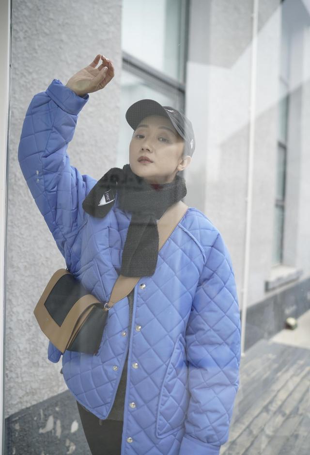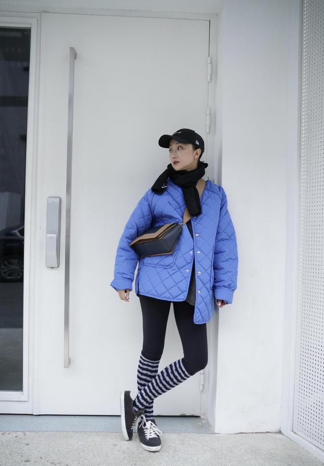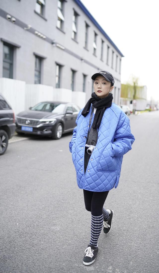 虽然穿衣搭配非常老干部,但穿出来的效果非常减龄,蓝色短款羽绒服棉衣颜色非常抢眼,给人的视觉效果非常舒服。黑色紧身长裤搭配外穿的条纹长袜,黑色帆布鞋非常休闲。斜挎一款卡其色单肩包,棒球帽和黑色围巾的搭配非常保暖,瞬间减龄十岁。