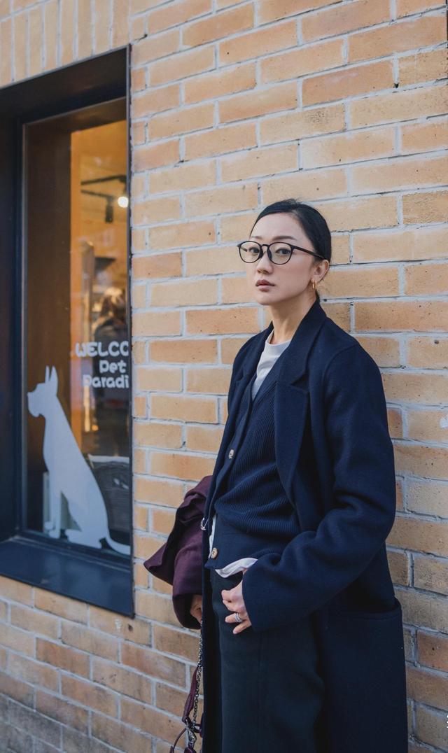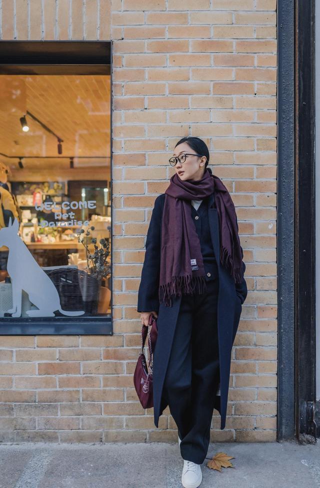 难得一见看到张瑶这么知性大方的一面,黑色马甲搭配黑色休闲直筒裤和小白鞋,内搭相对来说非常舒适。最亮眼的是外面搭配的这一款黑色长款风衣,直筒型的垂坠感设计可以走出走路带风的效果,深咖色围巾和同款颜色手提包女人味十足。